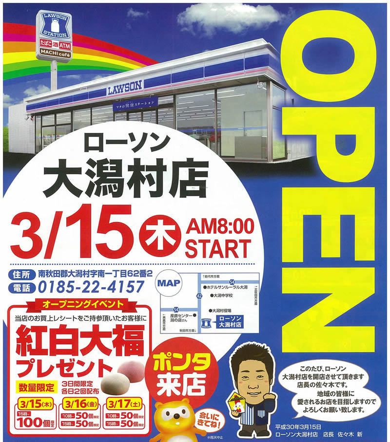 さて、当JA直営のコンビニエンスストア「ローソン大潟村店」が3月15日(木)8:00にオープンいたします。