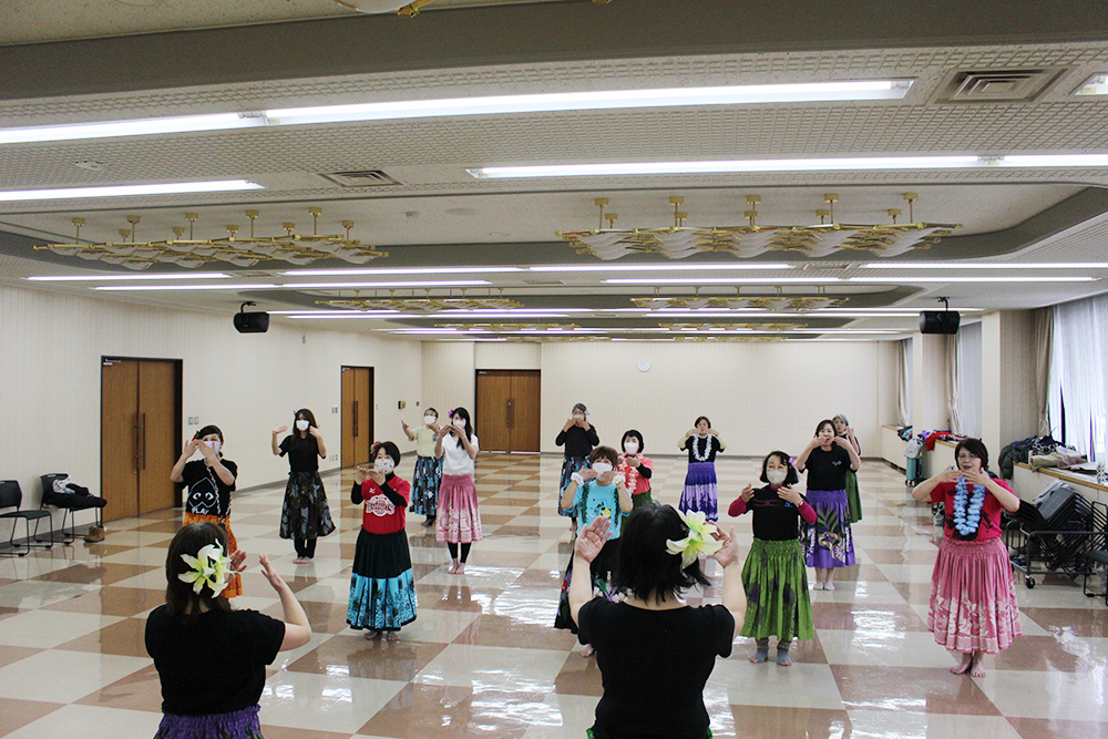 雪国では冬に運動不足になりがち。解消のため女性部が講師を呼んでフラダンス教室を開催。