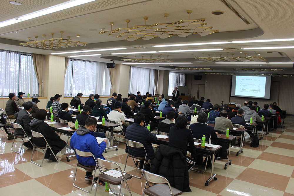 今回の組合員研修会では、「米の作柄分析」「乾田直播」「今後の米相場と米政策」について勉強。
